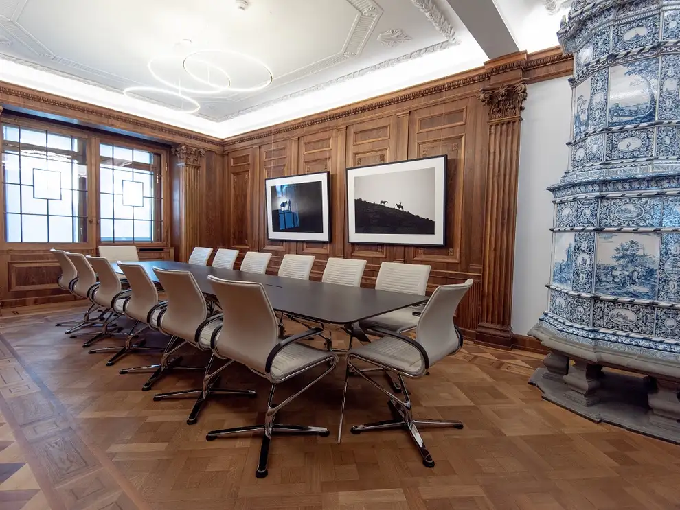 Gediegenes Sitzungszimmer mit edlem Holztisch, Designer-Stühlen und antikem Kachelofen – perfekt für vertrauliche Gespräche in stilvollem Ambiente.