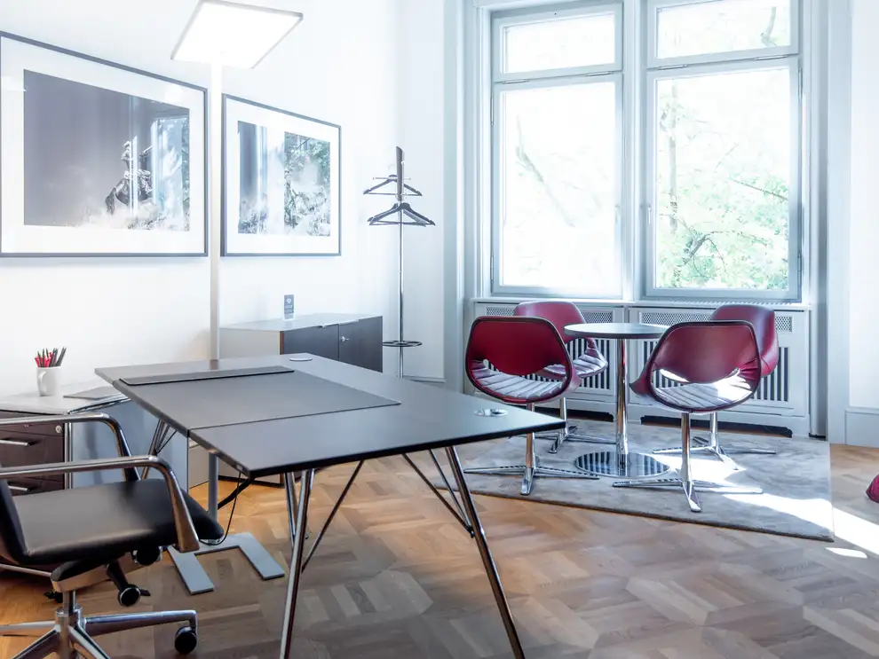 Helle, großzügige Tagessuite – ideal als kleiner Seminar- oder Workshopraum. Mit Chefarbeitsplatz, Besuchertisch und flexibler Buchung stunden- oder tageweise.