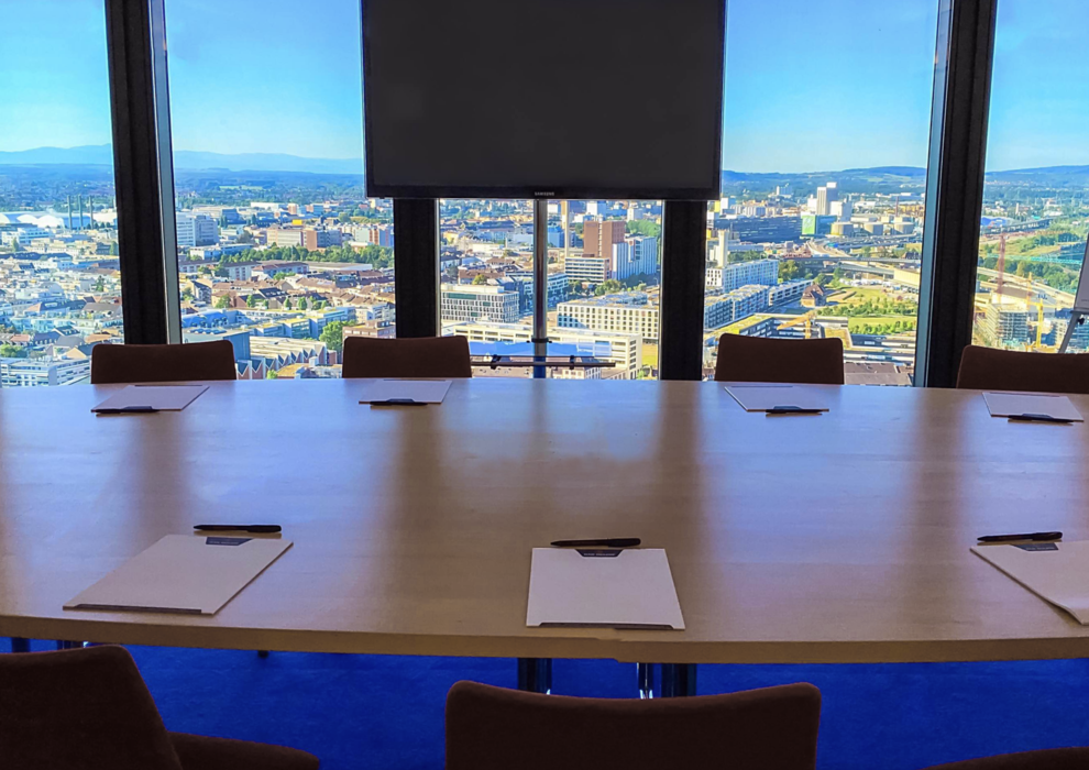 Faites passer vos réunions au niveau supérieur ! Aménagée dans le style d'une boardroom, la Meeting Room du 30e étage, qui peut accueillir jusqu'à 10 personnes dans la Messeturm Basel, est l'endroit idéal pour votre prochaine réunion.